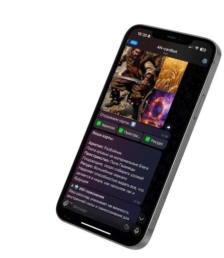 После разработки 190 метакарт AN, фирстиля, рубашек и коробки, мы сделали Telegram-бот, превращающий работу с картами в интерактивную сессию с ИИ-коучем.